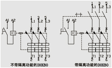 DHKBO結構采用倒裝式設計,接觸組觸頭及滅弧系統(tǒng)在安裝面底部,操作機構及電磁傳動機構在觸頭及滅弧系統(tǒng)的上部。觸頭的分合通過電磁傳統(tǒng)機構的銜鐵的吸合、斷開來實現(xiàn)。操作機構可通過就地或遠程控制電磁傳動機構的線圈通斷來控制產品接觸組的主觸頭通斷。